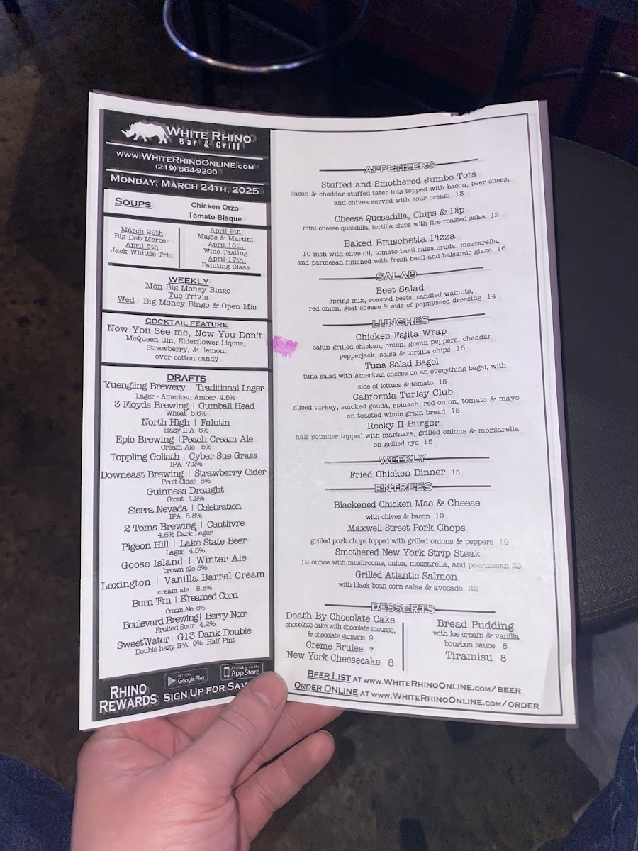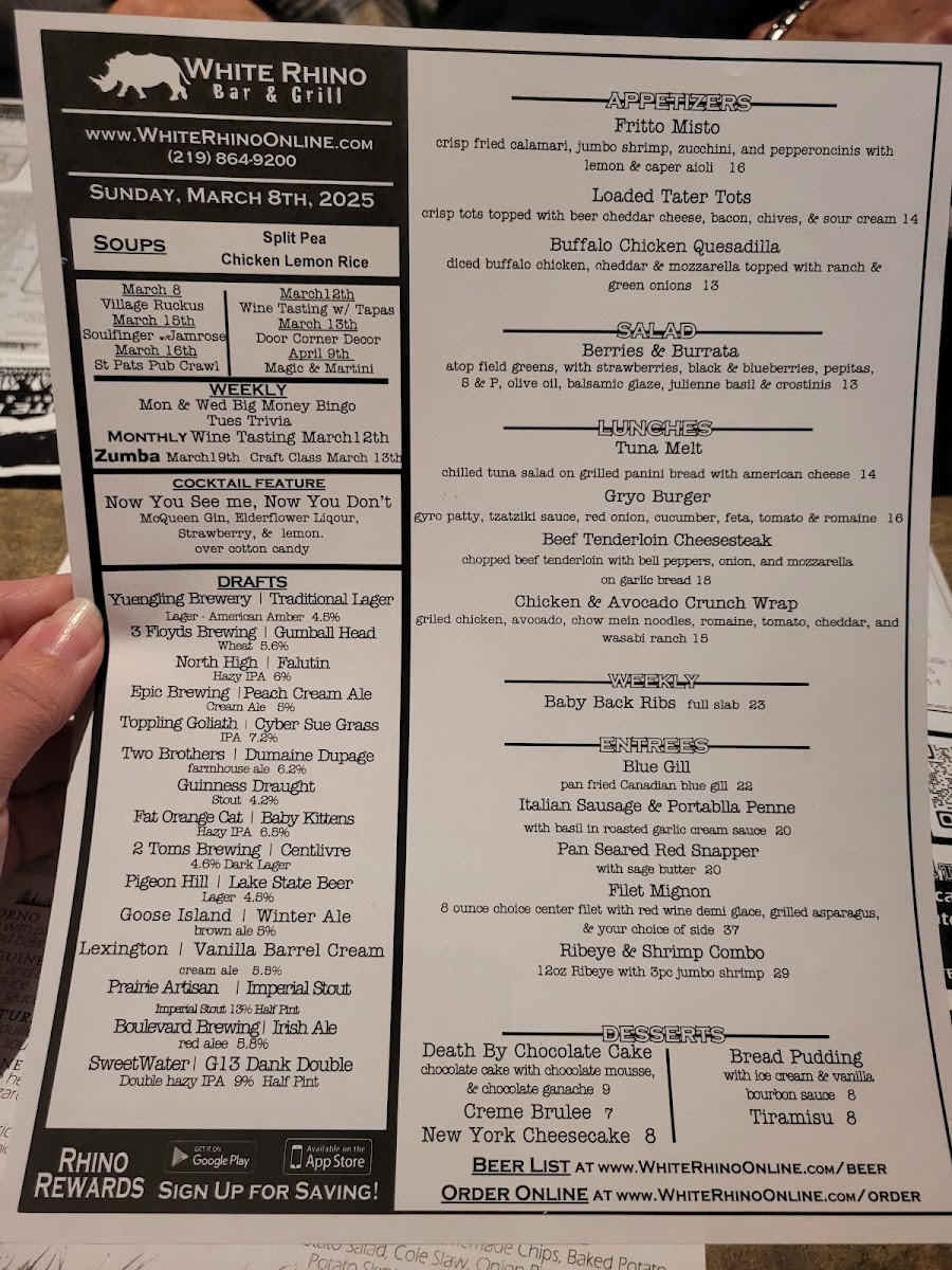 Welcome to White Rhino Bar & Grill, located at 101 Joliet St, Dyer, IN. This vibrant establishment offers a diverse menu, perfect for food lovers seeking more than just typical bar fare.